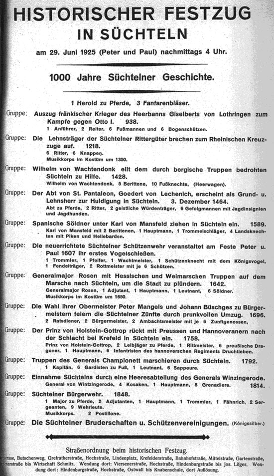 Außerdem wurde unter den Süchtelner Geschäftsleuten ein Schaufensterwettbewerb und unter den Anwohnern des Festzuges ein Balkon- und Fensterwettbewerb veranstaltet. Bürgermeister Steinbüchel bemühte sich auch für diese Zeit in Süchteln diverse Tagung abhalten zu lassen, unter anderem eine Tagung der Kreisbauernschaft, eine Veranstaltung der Frauenvereine des Kreises Kempen, eine Versammlung des Bühnenvolksbundes, ein Reitturnier der Reitvereine des Kreises und eine Tagung des Katholisch-Kaufmännischen Vereins e.V. Süchteln. Über den Regierungspräsidenten in Düsseldorf wurde eine Stellungnahme der Rheinlandkommission ( Sicherheitsausschuss ) eingeholt, da man bemüht war, die Ruhe und Ordnung in den französisch besetzten Gebieten, zu denen der linke Niederrhein gehörte, aufrechtzuerhalten. Das Zusammenströmen großer Menschenmassen, unter denen sich auch ein reicher Zustrom aus dem unbesetzten, rechtsrheinischen Gebiet befinden würde, gaben der Besatzungsbehörde zu erheblichen Besorgnissen Anlass. Letztlich wurde die Jahrtausendfeier ein großer Erfolg und trotz aller Befürchtungen seitens der Ordnungsmacht kam es zu keinerlei politischen Demonstrationen. Vor allem der historische Festzug durch die Süchtelner Innenstadt war ein farbenprächtiges und gutbesuchtes Ereignis, von dem die Menschen hier noch sehr lange schwärmten. |