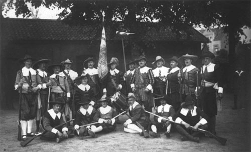 Gruppe 6: Die Süchtelner Schützenwehr von 1607 veranstaltet ihr erstes Vogelschießen - 1 Trommler, 1 Pfeifer, 1 Wachtmeister, 1 Schützenknecht mit dem Königsvogel, 1 Fendelträger und 2 Rottmeister mit je 6 Schützen |