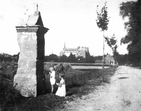 Betende Kinder am 6. Kreuzweg-Fußfall ( Foto um 1920 ) auf der oberen Bergstraße. Im Hintergrund das Irmgardis-Pensionat. Rechts auf dem Bild erkennt man am Rand noch ansatzweise den Eingang zum städtischen Friedhof ( seit 1888 auf der Bergstraße ). Auf diesem Foto sieht man auch sehr deutlich, dass die ortsansässigen Bauern die Rückseiten der Bildstöcke oft zum Schärfen ihrer Sensen „missbrauchten“. Der Liedberger Sandstein scheint zur Pflege des Arbeitsgeräts besonders gut geeignet gewesen zu sein, ist aber so weich, dass diese Prozedur im Laufe der letzten 300 Jahre gut erkennbare Spuren hinterlassen hat. |