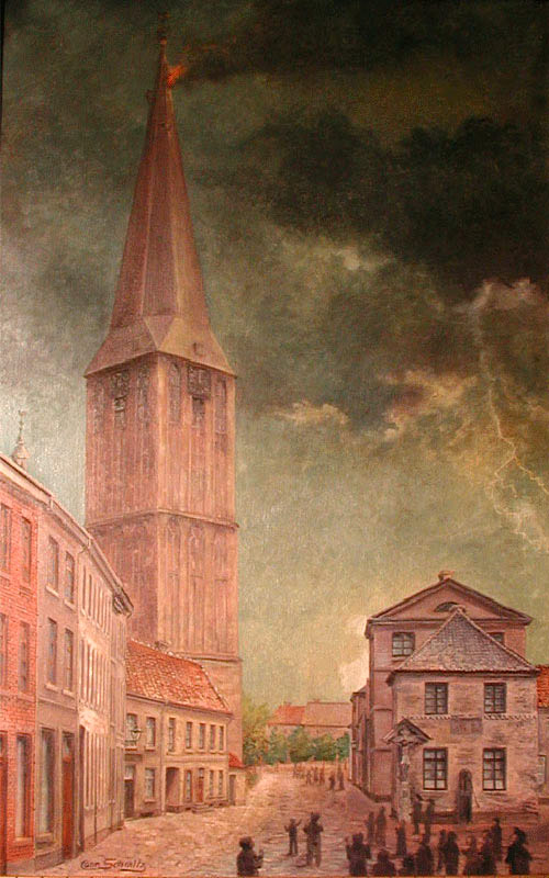 frühmorgens gegen 7 Uhr kamen vom Bruch her dunkle Wolken gezogen. Sie schienen sich mit ehernen Fäusten an den Turm zu klammern. Da plötzlich ein Blitzstrahl, begleitet von einem gewaltigen Donnerschlag. Der ganze Turm
