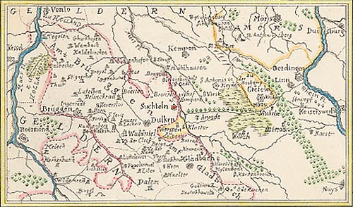 Diese alte Karte vom Niederrhein zeigt Süchteln an der Niers zwischen Maas und Rhein ( Venlo links oben, Roermond links unten, Duisburg rechts oben und Neuss rechts unten ).